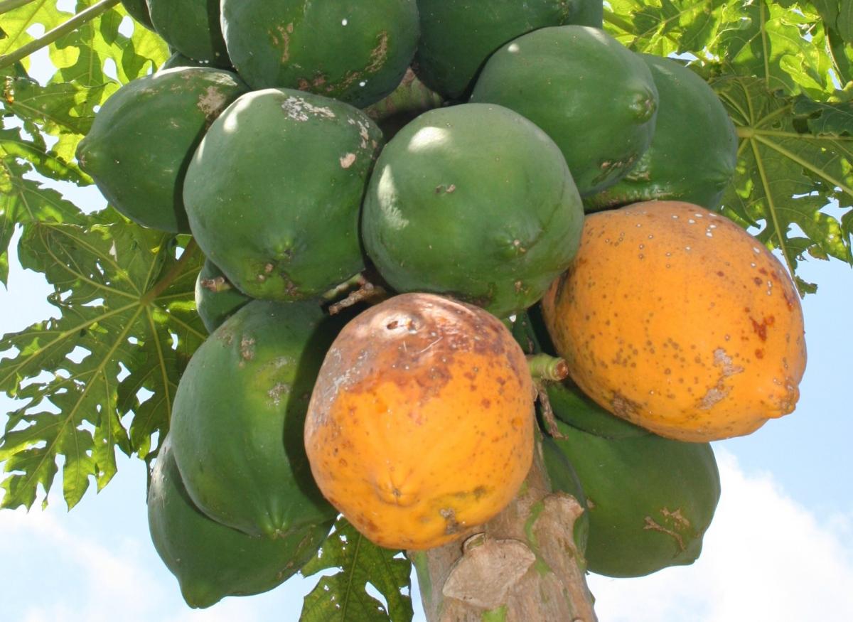 島では熟する前の青パパイヤを、炒め物やサラダ、漬物、佃煮にして食べます。脂肪を分解するパパイン酵素が含まれ、ダイエット食品としても注目されています。